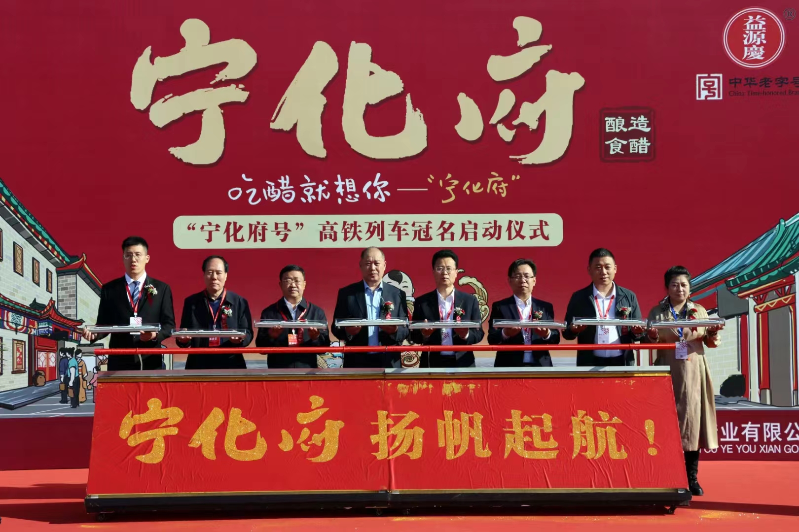 太原宁化府益源庆醋业有限公司董事长郝建国,山西省老字号协会常务副会长兼秘书长、山西省食品有限公司党总支书记、董事长乔志军,神农集团品牌运营管理(山西)有限公司党支部书记、执行董事刘佑利,山西省食品工业协会常务副会长、山西省食品检验检测中心副主任郭东以及山西省名优土特新产品协会会长王学苏等重要领导,共同见证了“宁化府”号列车启航的重要时刻。在现场,老品牌 新国潮的时代风范吸引了众多的旅客和游客驻足观看,人们对健康生活方式的追求与向往,现代科技与韵味老字号的碰撞交融,打破传统边界,尝鲜新文化的时代风味,无处不彰显着我们民族的风范与底气。