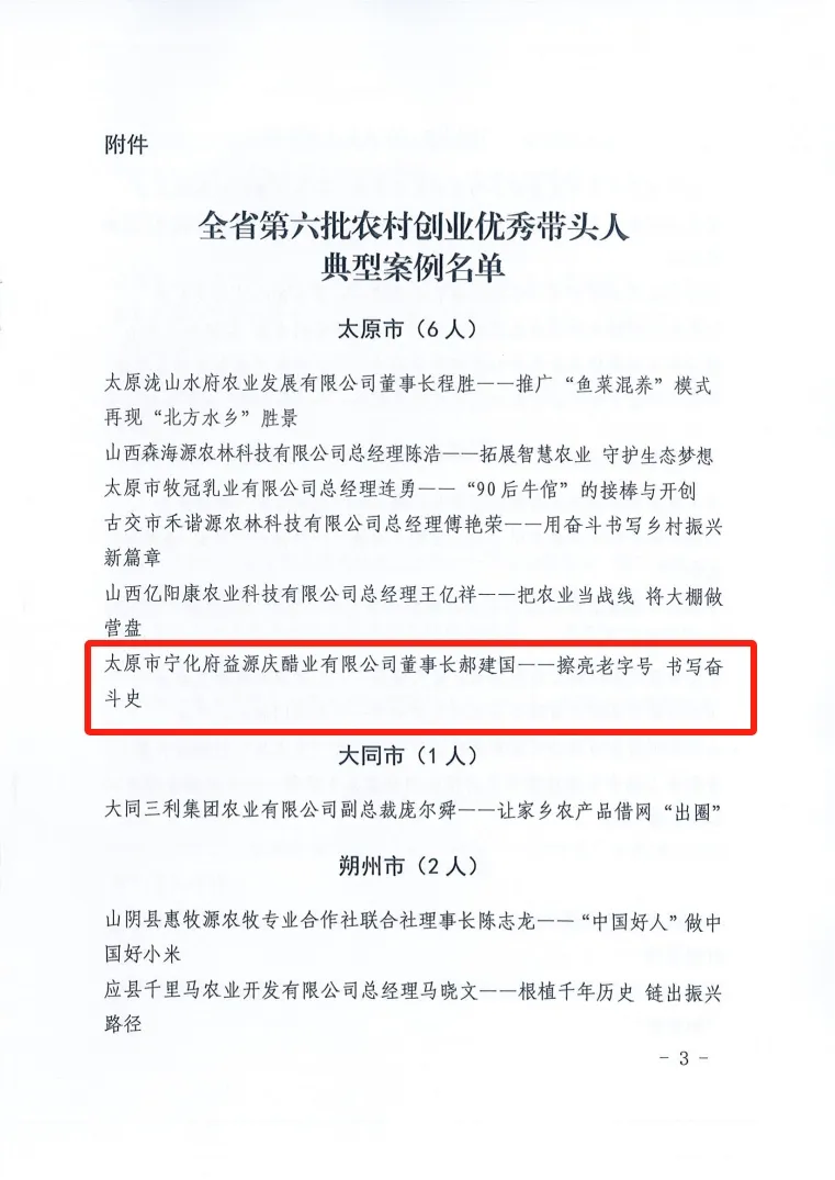 宁化府益源庆董事长郝建国入选全省第六批农村创业优秀带头人典型案例名单