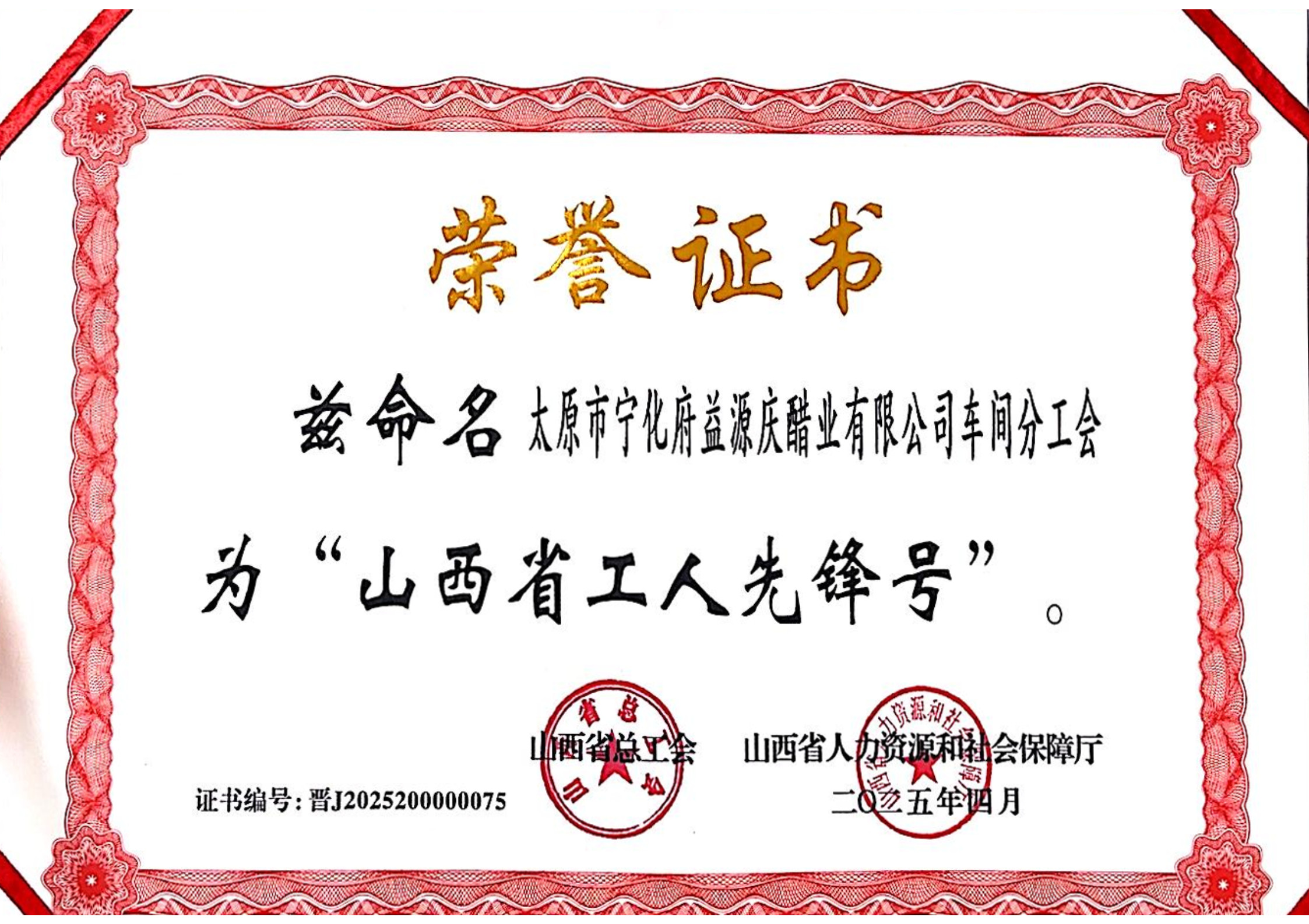 4月30日举行的山西省五一劳动奖表彰大会上,有438个集体和个人受表彰。其中,山西省五一劳动奖状70个、山西省五一劳动奖章268个、山西省工人先锋号100个。太原市宁化府益源庆醋业有限公司车间分工会被授予“山西省工人先锋号”荣誉称号,这是对团队团结拼搏、精益求精、勇于创新的高度认可。