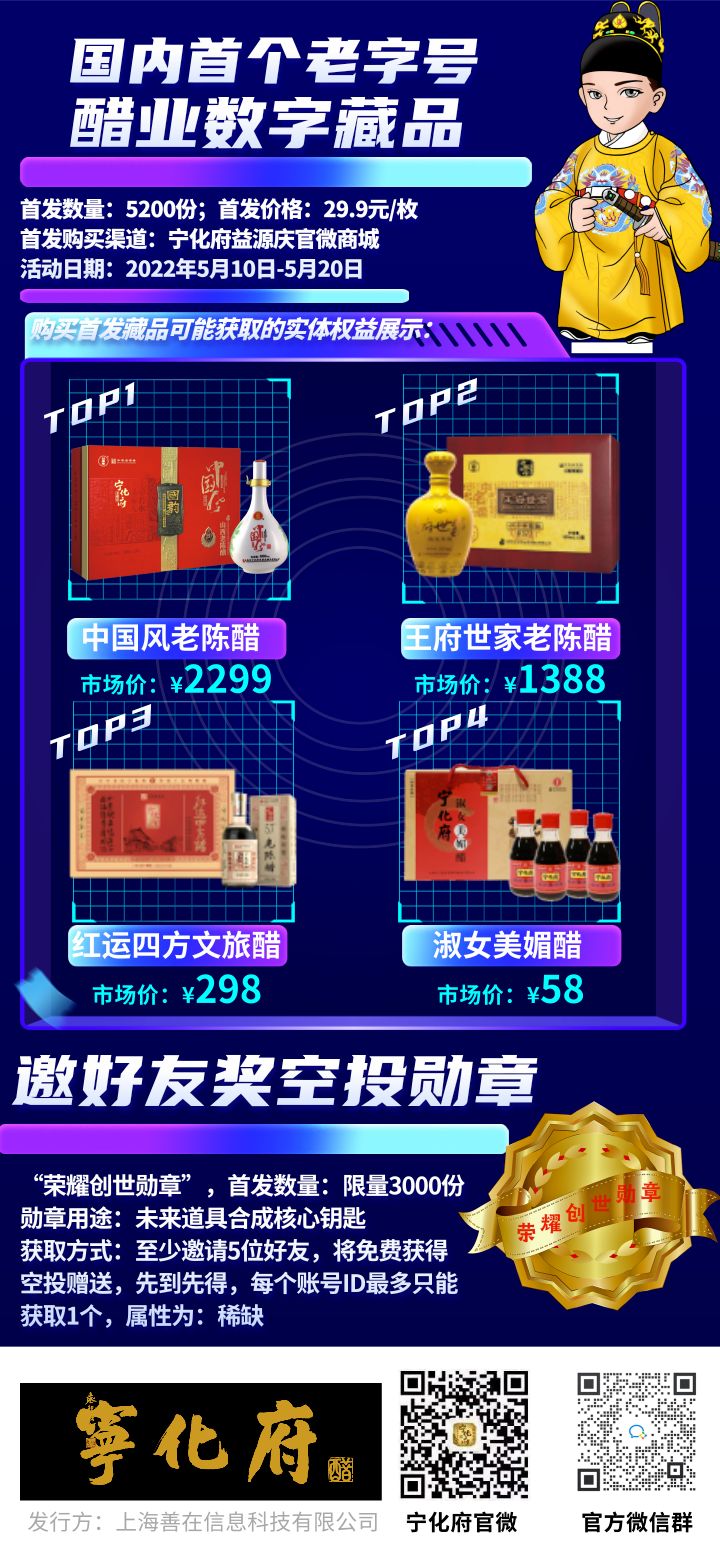 “宁化府”和善在科技联手,即将在2022年5月20日面向全国发行中国食醋行业的第一款数字藏品,这也是宁化府的首个数字藏品,共计5200份,本次活动从2022年5月10日开始预发售,快来参与吧!